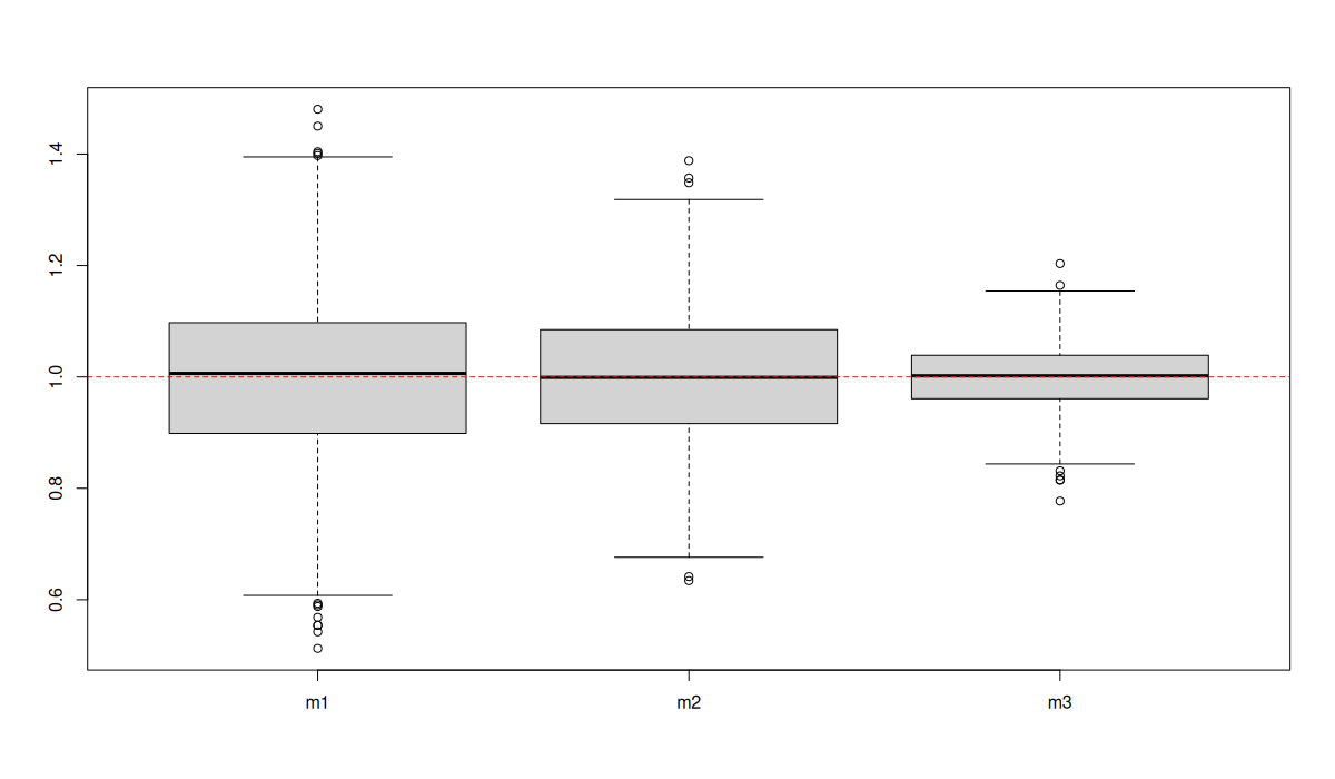 Estimate for \(\beta_1\) in 1000 simulations (\(m_3\) is correct model):