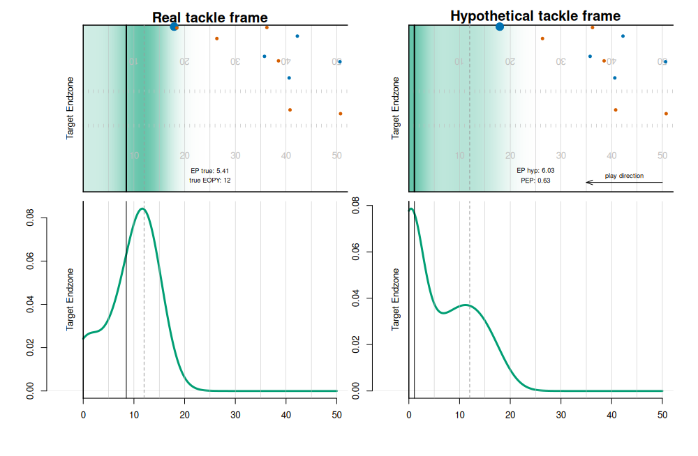 Deriving the expected points prevented by a tackle via conditional density estimation of the yards gained by the ball carrier.